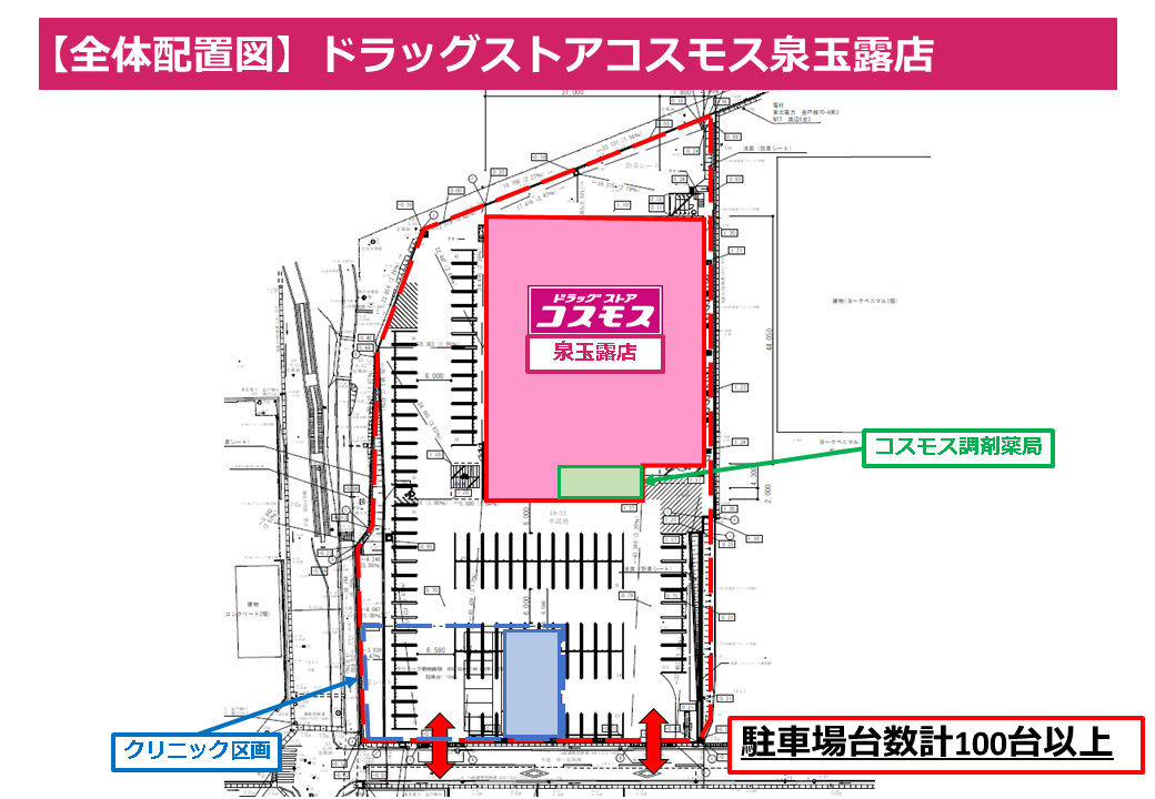 - 隣接地でドラッグストアが営業予定です。 早期の認知拡大と継続的な集患が見込めます。